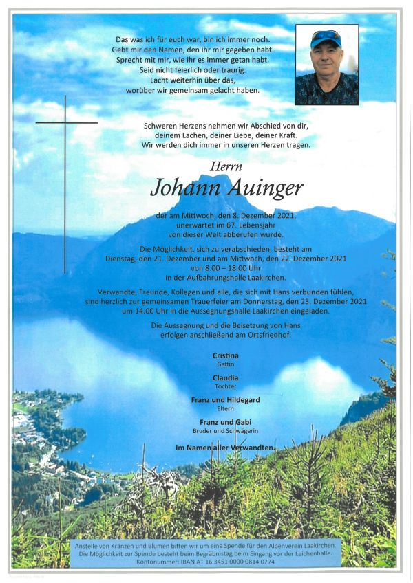 Maria und Manfred Leitner13. Dezember 2021 um 20:50Permalink Nicht das Sein und nicht das Haben stellt den Wert des Menschen dar. Nur das Eine zählt im Leben was der Mensch den Seinen war. Unsere aufrichtige Anteilnahme.