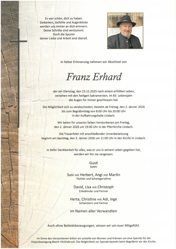 die Nachricht vom Tod deines Mannes, eures Vaters und Opas hat uns sehr betroffen gemacht und wir möchten euch unser aufrichtiges Beileid aussprechen. In Erinnerung bleiben uns die Begegnungen mit Franz, wenn wir bei euch vorbeispaziert sind: Immer ein freundlicher Gruß, ein Lächeln auf den Lippen und ein kurzes „Plauscherl“. Für die kommende schwere Zeit wünschen wir euch viel Trost, Kraft und Menschen um euch, die euch guttun.